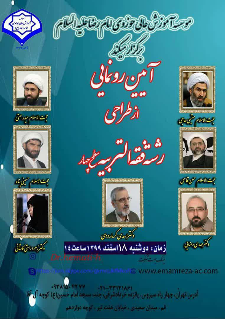 به همت موسسه آموزش عالی حوزوی امام رضا(ع)، آیین رونمایی از طراحی رشته فقه التربیه (سطح چهار) روز دوشنبه 18 اسفند 99 ساعت 14با حضور اساتید حوزه و دانشگاه و اعضای گروه علمی فقه التربیه در محل این موسسه و از طریق فضای مجازی اینستاگرام به نشانی dr.hemati_h برگزار می شود.